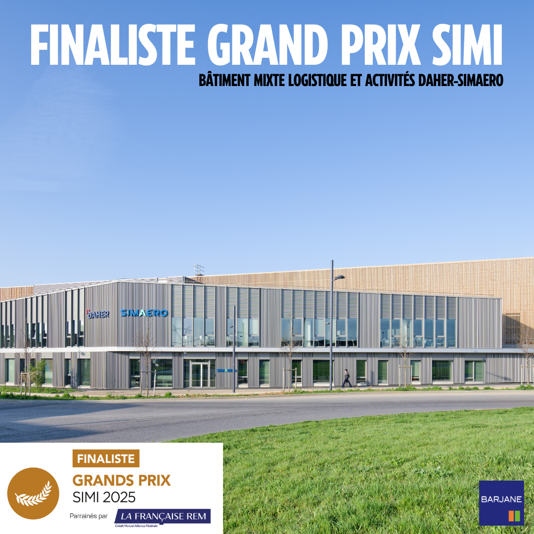🏆 Cette année encore, BARJANE est finaliste des hashtag#GrandsPrixSIMI2025 dans la catégorie Immeuble logistique et messagerie avec le bâtiment mixte logistique et activités Daher–Simaero, situé à Ville de Tremblay-en-France, au cœur de la zone AeroliansParis.